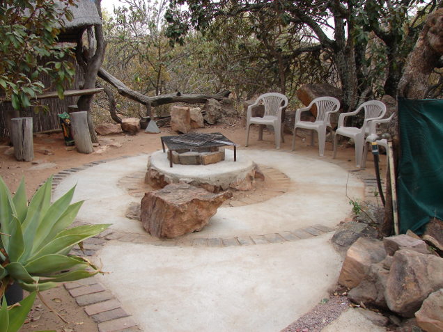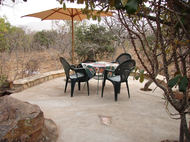 The veld garden features a small lapa and a place with a view from underneath an umbrella.